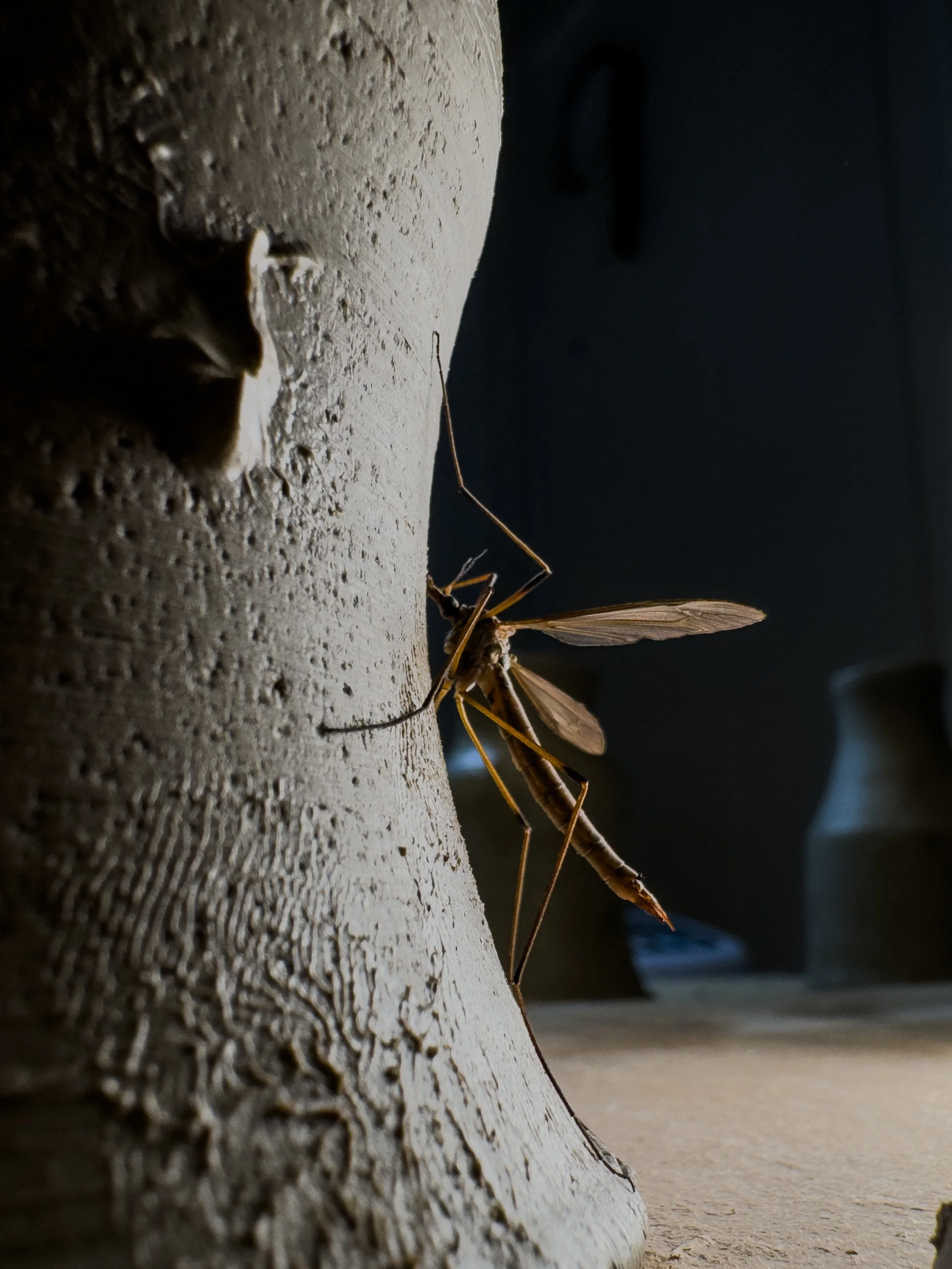 A big-ass mosquito (aka crane fly) was smitten with his freshly thrown pot. Maybe it was the texture?